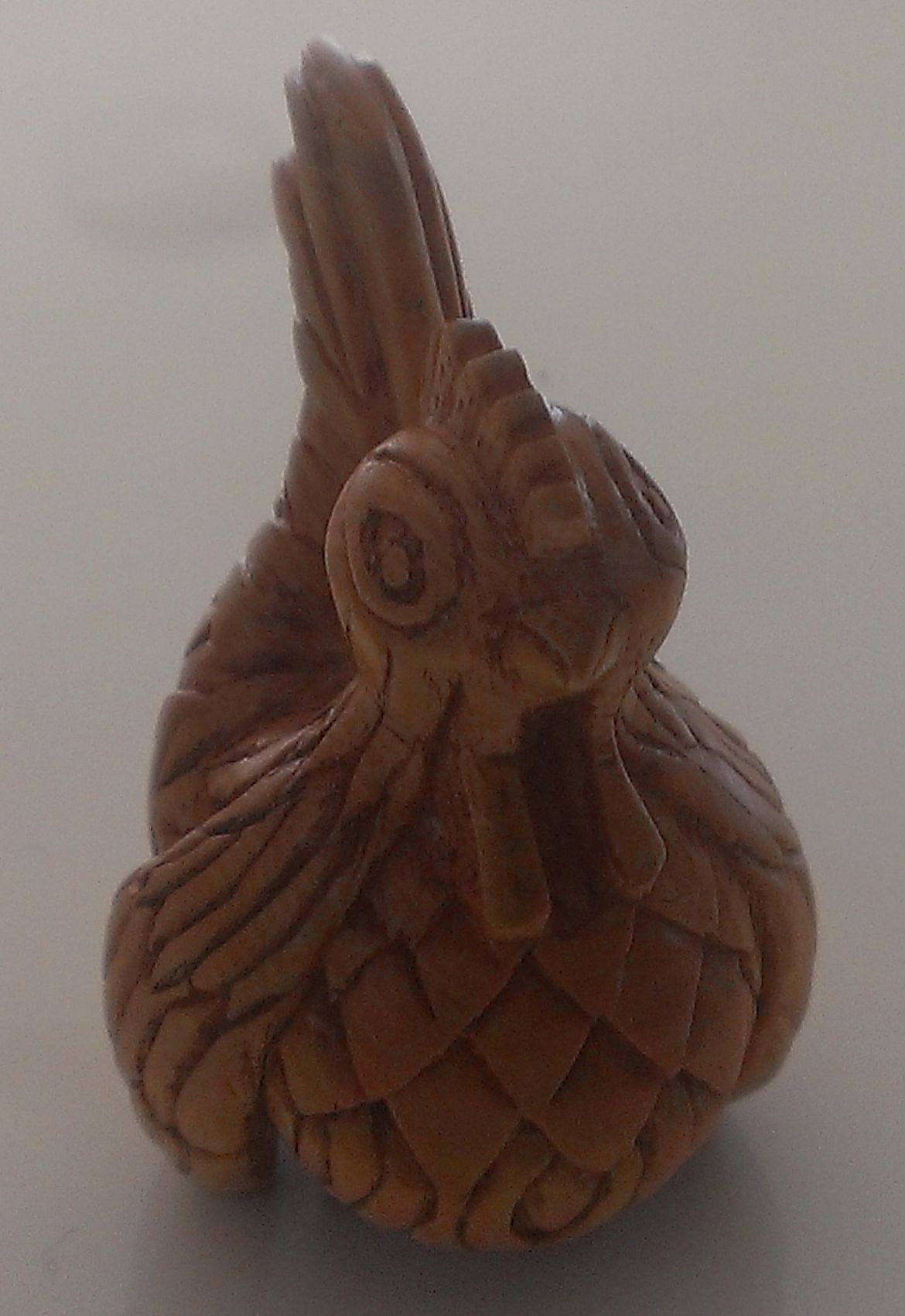 Well, we call them chooks here in Aus, although he is meant to be a rooster but ended up looking more like a homely hen. I drew up the pattern from various pictures of chickens found on the internet and fashioned him firstly from plasticene so I could visualise him from all angles. The carving is done from huon pine, and this piece was particulary hard and close grained,although often huon can be like butter to carve but you have to be careful as it is easy to catch the grain in the wrong direction where a chunk will lift or leave a very rough patch underneath. It will finish beautifully with a good sanding.